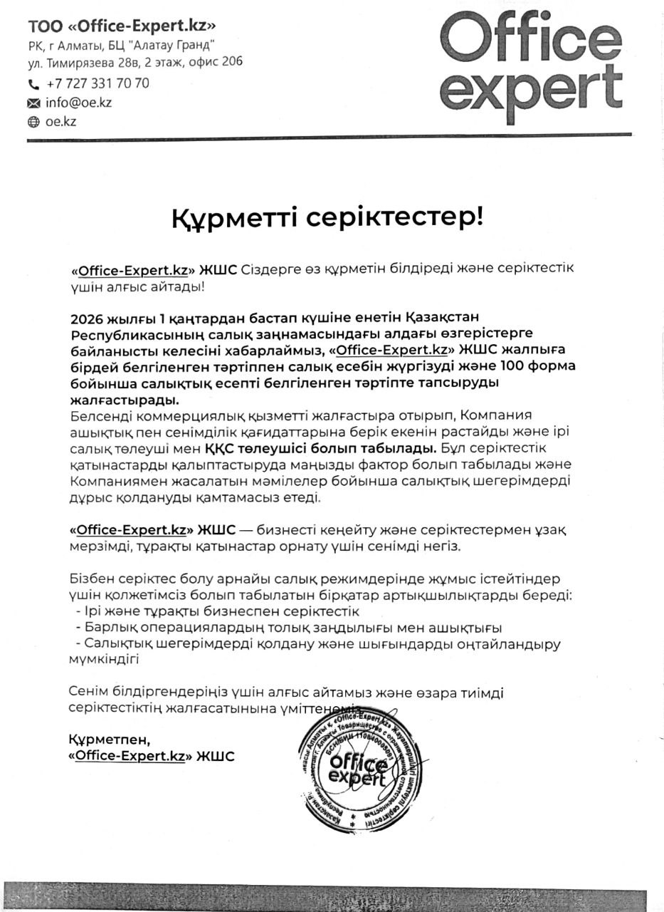 2026 жылғы 1 қаңтардан бастап күшіне енетін Қазақстан Республикасының салық заңнамасындағы алдағы өзгерістерге байланысты келесіні хабарлаймыз, «Office-Expert.kz» ЖШС жалпыға бірдей белгіленген тәртіппен салық есебін жүргізуді және 100 форма бойынша салықтық есепті белгіленген тәртіпте тапсыруды жалғастырады.